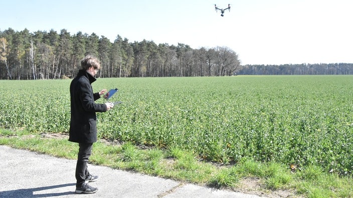Zusammen mit einem Agrarbetrieb bei Hoyerswerda testen sie aber ein Drohne, die bei der Bestellung der Felder helfen soll. Nachdem ein Pilot die Drohne gestartet hat, surrt die Maschine in vorgeschriebenen Rastern selbstständig über das Feld.