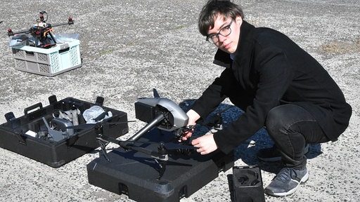 Der Student hat eine professionelle Drohne startklar gemacht und hebt ab in Richtung Kiefernwald.